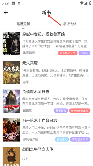 2、點擊新書進入對應頁面,分最近更新與最近完結板塊,展示新上架的小說作品,標注作品題材與內容簡介,可選擇感興趣的作品進入詳情頁面。