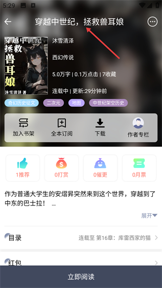 3、進入書籍詳情頁,可查看作品的字數點擊量等數據,支持加入書架全本訂閱等操作,還能進行推薦打賞等互動,點擊立即閱讀即可開啟作品閱讀。