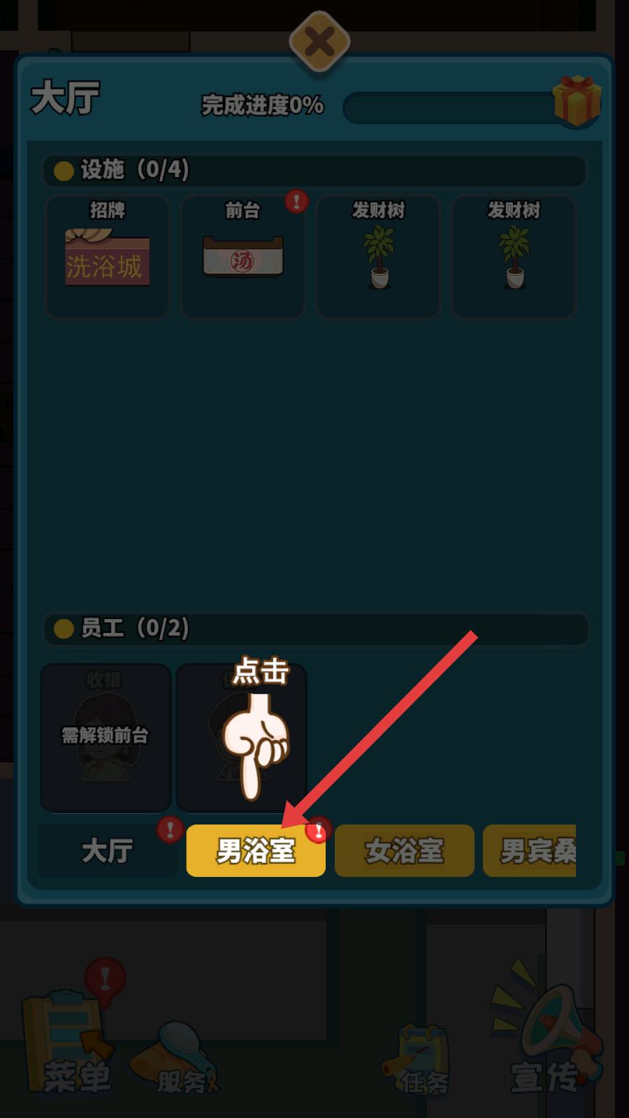 2、進入大廳界面,能看到設施、員工等板塊,接著點擊男浴室選項,準備在男浴室區域進行后續的布置與經營。