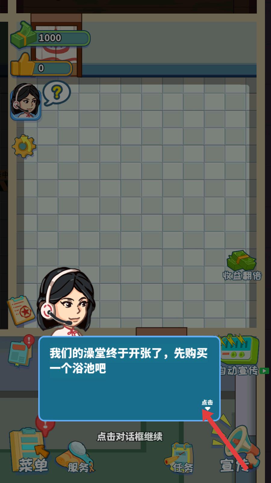1、澡堂開張后,先按提示去購買一個浴池,這是開啟洗浴城經營的第一步,有了浴池才能迎接客人。