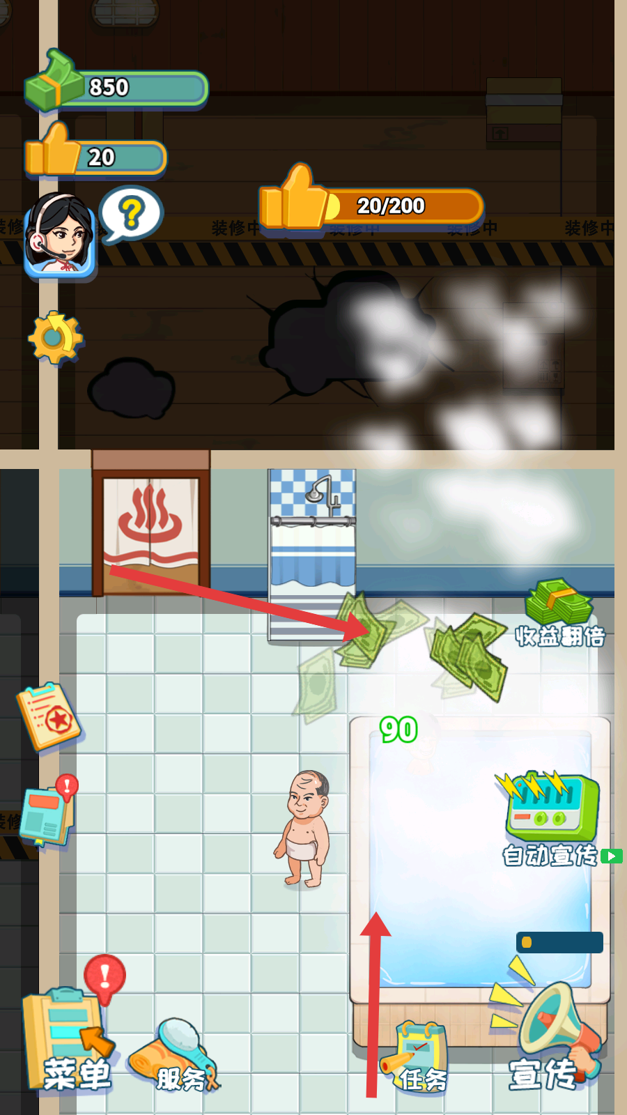 4、解鎖浴池后,會有客人前來使用,客人使用后會產生收益,可點擊收益獲取,同時還能通過宣傳等方式吸引更多客人。