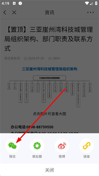 4、查看資訊時可將內容分享到微信、朋友圈、微博或生成鏈接,方便用戶傳播科技城相關資訊。