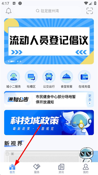 1、首頁可查看流動人口登記倡議,使用城小二服務、吐槽區、公交出行等功能,還能瀏覽通知公告和科技城政策資訊。