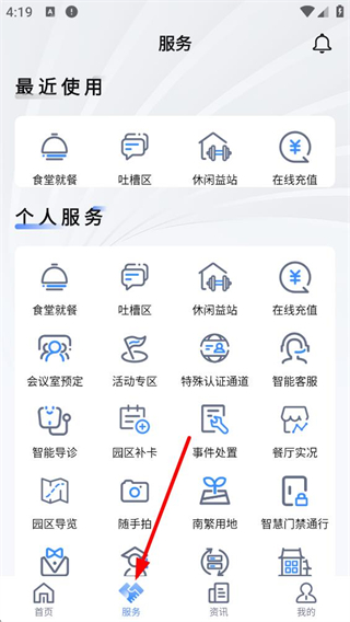2、進入服務界面,可查看最近使用的服務,還有個人服務如食堂就餐、吐槽區、會議室預定等多種功能,滿足園區生活和工作需求。