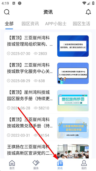 3、資訊界面可查看全部、園區資訊、APP小貼士、園區生活等分類資訊,了解三亞崖州灣科技城的管理局架構、服務手冊等信息。