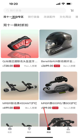 3、商城界面,設雙十一活動專區,有騎行裝備等分類,展示頭盔藍牙等商品,用戶可選購騎行相關產品。