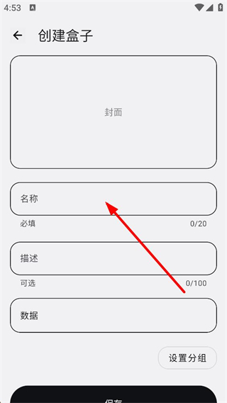 2、創建盒子頁面,有封面、名稱等填寫區域,點擊數據對應的區域,進入添加數據的界面,選擇所需數據類型。
