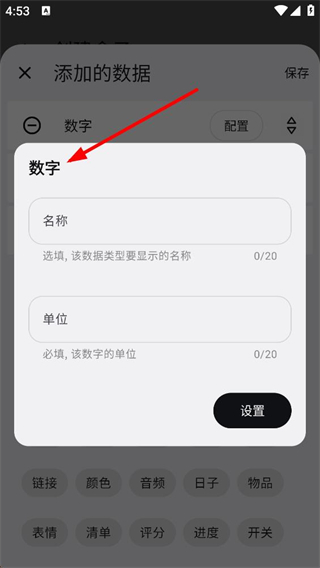 4、數字類型配置頁面,填寫選填的名稱與必填的單位,點擊設置按鈕,完成該數據類型的配置操作。