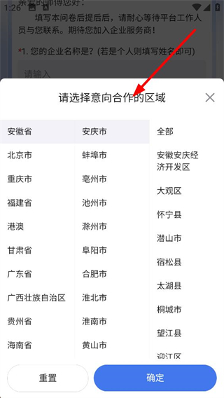 4、填寫問卷時選擇意向合作區域,會彈出區域選擇彈窗,可從省份、城市、區縣層級選擇對應區域,確認后點擊確定完成選擇。
