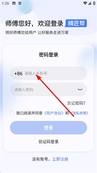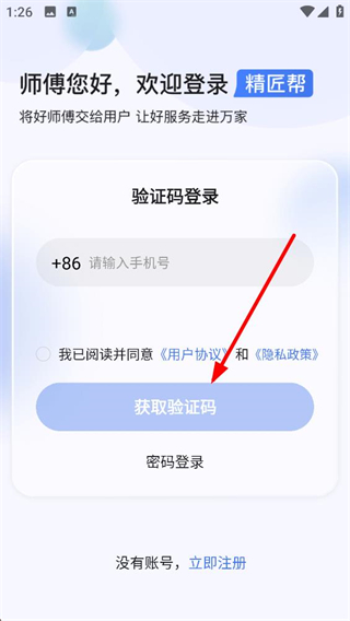 2、切換至驗證碼登錄方式,輸入手機號碼并勾選協議后,點擊獲取驗證碼,后續填寫驗證碼即可完成賬號的登錄操作。