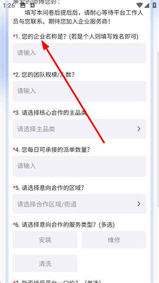 3、登錄后可進入合作問卷填寫頁面,需依次填寫企業名稱、團隊規模等必填信息,完成后提交問卷等待平臺工作人員聯系。