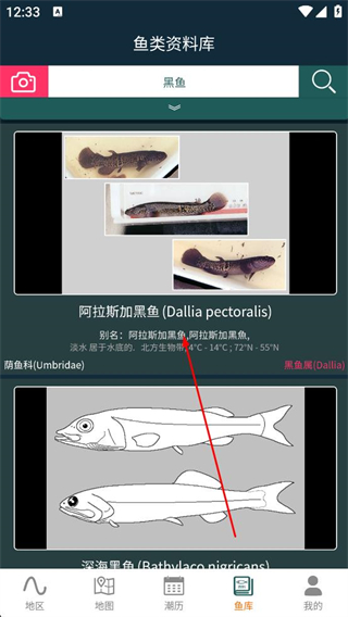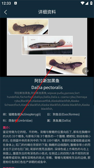 3、在搜索結果中選擇阿拉斯加黑魚,點擊進入該魚類的詳細資料頁面。