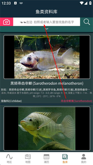 1、其中魚庫中超過萬種魚類信息資料,并可以通過照片識別魚或者蝦蟹之類的海洋生物。