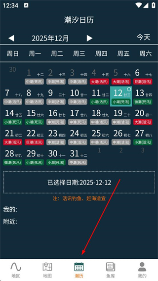 1、打開軟件進入潮汐日歷頁面,確認日期后點擊魚庫選項,進入魚類資料庫頁面,準備查詢魚類信息。