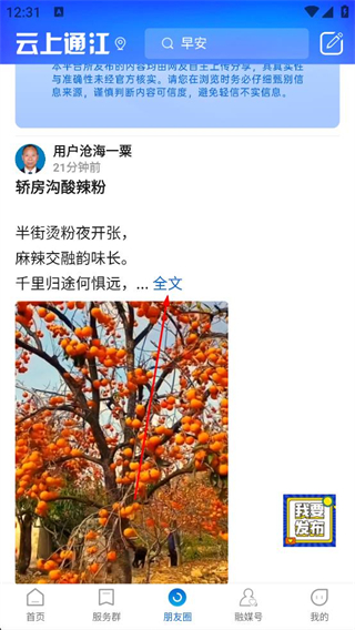 2、登錄后進入朋友圈頁面,瀏覽用戶分享的資訊內容,選擇目標動態如新房溝酸辣粉,點擊查看全文。