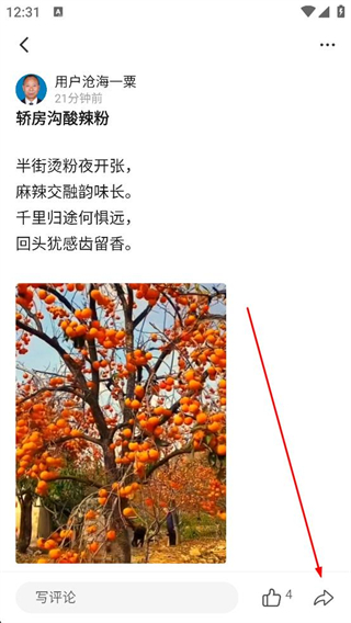 3、在動態詳情頁閱讀內容并查看配圖,點擊分享圖標,打開分享選項菜單選擇分享渠道。