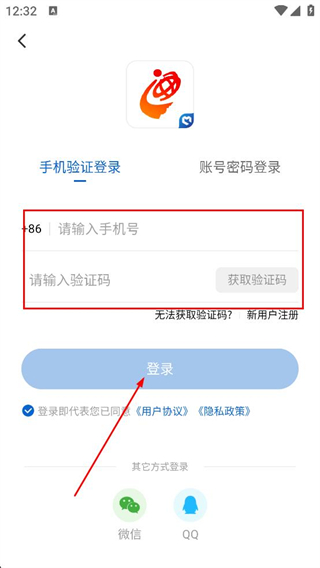 1、進入手機驗證登錄頁面,輸入手機號獲取并填入驗證碼,勾選相關協議后點擊登錄按鈕完成賬號登錄。
