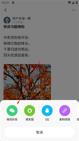 4、在分享菜單中選擇微信好友等渠道,可將該動態內容分享至對應平臺,完成分享。