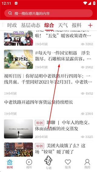 2、登錄成功后進入綜合資訊頁面,瀏覽推薦內容列表,選擇每天與一件國寶相遇相關資訊,點擊進入該資訊的詳情頁面。