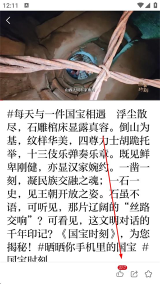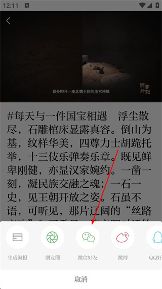 3、在資訊詳情頁閱讀國寶相關的介紹內容,找到頁面底部的分享按鈕,點擊彈出分享平臺選擇界面。