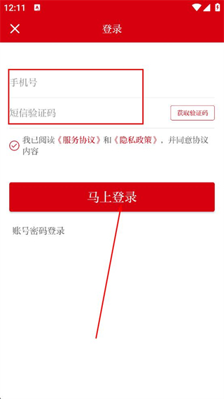 1、打開軟件進入登錄頁面,填寫手機號并獲取短信驗證碼填入對應框,勾選協議后點擊馬上登按鈕完成賬號登錄。