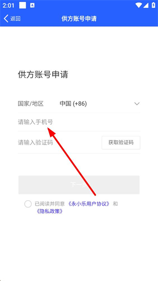 4、登錄頁面點擊供方賬號權限申請,進入申請頁面,選擇對應地區,輸入手機號并獲取驗證碼,勾選協議后可進行下一步申請操作。