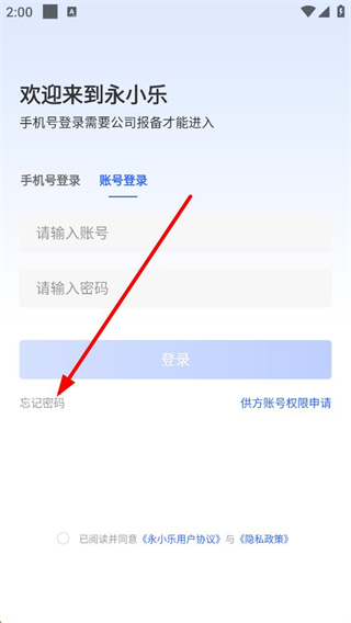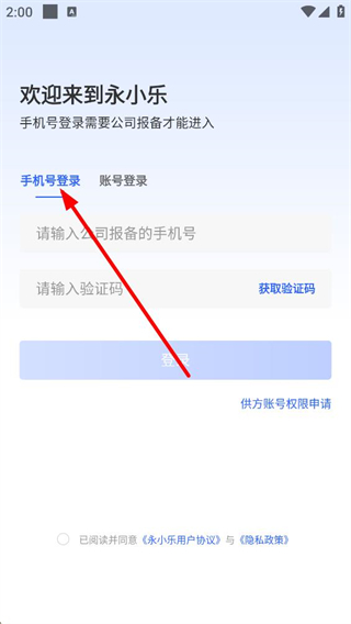 1、進入永小樂的登錄頁面,選擇手機號登錄方式,需輸入公司報備的手機號,獲取并填寫驗證碼,勾選用戶協議與隱私政策后,可嘗試登錄系統。