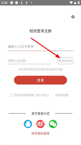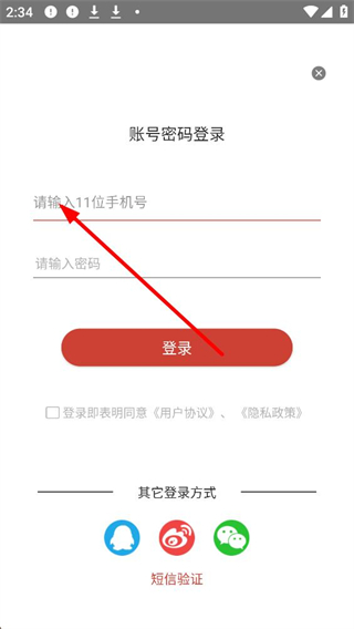 3、登錄界面,可選擇賬號密碼登錄,輸入11位手機號和密碼,也可選擇短信驗證登錄或其他登錄方式,登錄前需勾選同意用戶協議和隱私政策。