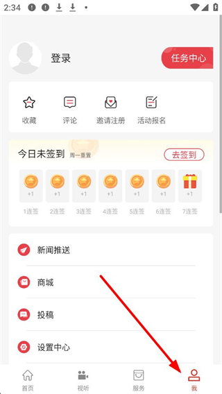 2、點擊底部我的按鈕,進入個人界面,可看到登錄提示,還有收藏、評論等功能入口,未登錄時可進行登錄操作。