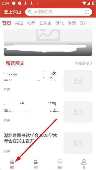 1、進入APP首先看到首頁,展示興山、推薦等板塊,還有精選圖文資訊,可瀏覽本地新聞、專題內容等信息。