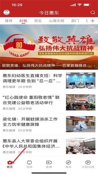 1、首頁板塊,有時政、民生等頻道,展示致敬抗戰英雄、惠東婦幼醫生直播等資訊,可搜索獲取信息。