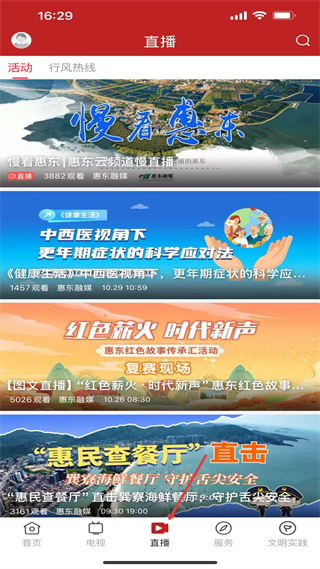 3、直播板塊,有活動、行風熱線分類,展示慢看惠東云頻道慢直播、更年期癥狀科學應對等直播內容,可觀看各類直播活動。