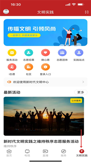 4、文明實踐板塊,有服務活動、志愿招募等功能入口,展示新時代文明實踐志愿服務活動,可參與文明實踐相關事務。