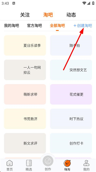 3、進入淘吧頁面,能查看我的淘吧官方淘吧等分類,瀏覽全部淘吧的內容,還可以點擊創建淘吧來建立專屬的淘吧板塊。