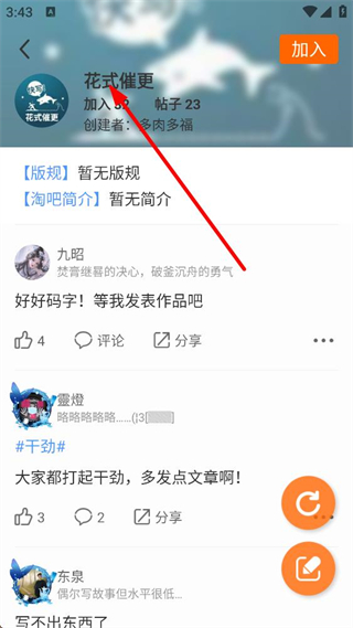 4、選擇對應的淘吧進入詳情頁,可點擊加入按鈕成為該淘吧成員,還能查看淘吧內的帖子,參與點贊評論等互動操作。