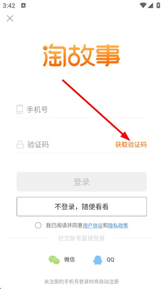 1、進入淘故事登錄頁面,可填寫手機號并獲取驗證碼登錄,也能選擇不登錄隨便看看,還可通過微信QQ等社交賬號登錄,勾選協議完成操作。