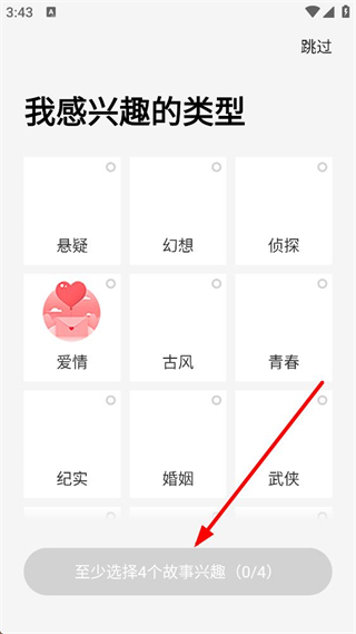 2、登錄后進入興趣選擇頁面,需從懸疑幻想等故事類型中至少選4個興趣,選滿對應數量后,即可進入后續的功能界面。