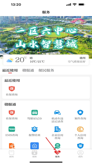 3、進入服務界面,可查看當地天氣信息,使用社保查詢、駕駛證記分等贛服通相關便民服務功能,獲取生活與政務服務。
