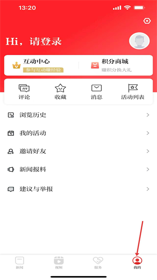 4、切換到我的界面,需進行登錄操作,可使用評論、收藏等互動功能,管理瀏覽歷史、參與活動,處理個人相關的操作與設置。