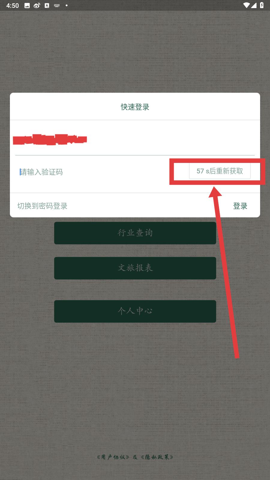 3、來到下一步,我們輸入了手機號碼,查看箭頭所指的地方,點擊獲取驗證碼,等待短信發送,輸入驗證碼在橫線上,點擊登錄即可。