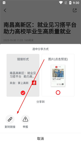 4、點擊分享按鈕在彈出的選項中選擇鏈接形式,再點擊復制鏈接按鈕,完成該文章鏈接的復制。