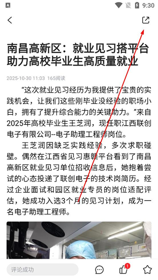 3、在文章詳情頁閱讀就業見習平臺助力畢業生就業的內容,了解具體案例及服務模式,之后找到頁面上的分享按鈕。