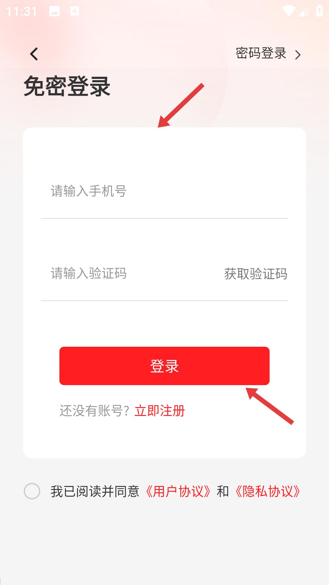 4、在登錄頁面,可選擇免密登錄,輸入手機號和驗證碼,點擊登錄按鈕即可完成登錄操作。