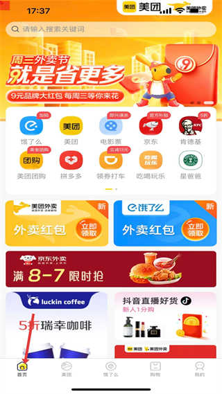 1、首頁,有搜索欄,展示周三外賣節活動及餓了么等平臺入口,還有外賣紅包板塊,助力了解活動和獲取優惠。