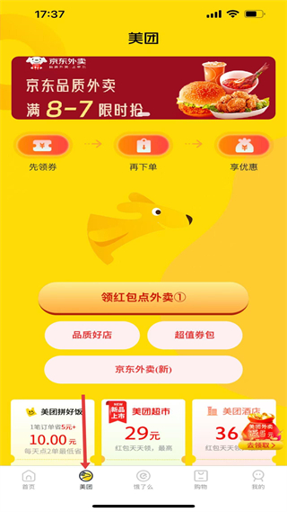 2、美團板塊,呈現領紅包點外賣入口及品質好店等功能,還有美團拼好飯板塊,方便使用美團平臺服務。