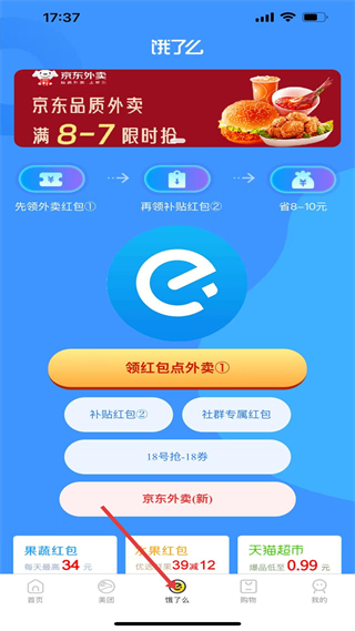 3、餓了么板塊,提供領紅包點外賣入口及補貼紅包等功能,還有京東外賣及果蔬紅包板塊,方便使用餓了么平臺服務。