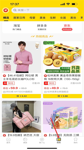 4、購物板塊,涵蓋淘寶等電商平臺入口,展示針織衫等熱銷商品,標注價格及優惠券信息,方便選購商品。