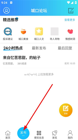 4、進入論壇頁面,可看到精選推薦板塊,有投訴建議、城口美食等分類,還有24小時熱點等帖子列表,點擊發布可進行發帖操作,參與論壇互動。