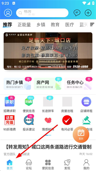 1、進入首頁可看到搜索欄,還有推薦、正能量等分類標簽,下方有熱門鄉鎮等板塊,以及招聘求職、便民信息等功能入口,能便捷獲取各類本地信息。