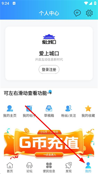 2、點擊我的可進入個人中心,該頁面有登錄注冊按鈕,還有我的主頁、我的帖子等功能入口,可查看和管理個人相關信息。
